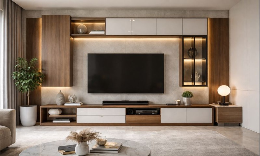 Sleek TV Unit Designs with Wood and High-Gloss Laminates